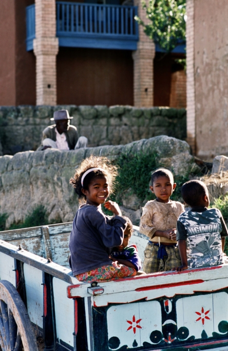 Madagascar Enfant Ambatomandodonaassisbalcon bleucharrettegrand pèrejeumaison gasyquatre enfants
