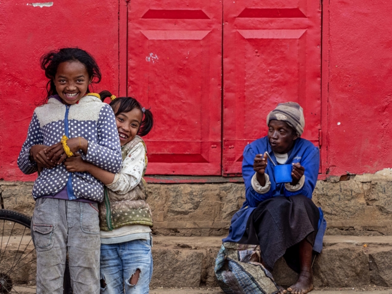 Madagascar Enfant Ambatolampydeux fillettesmur rougepose photoprise de vueriresrue principaletrottoir