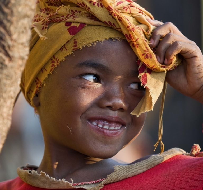 Madagascar Enfant 3/4Dabolavafichu jaunefillettefin de journéeGPmain levéepull rougerue hautesix anssoleil couchantsourire