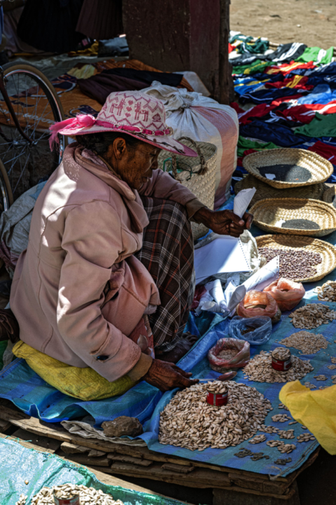 Madagascar Femme Ambohimandrosoany an-tsenaat marketchapeaucommerçantegonygrainesmadcoseptembre 2025soleilvestevieille femme
