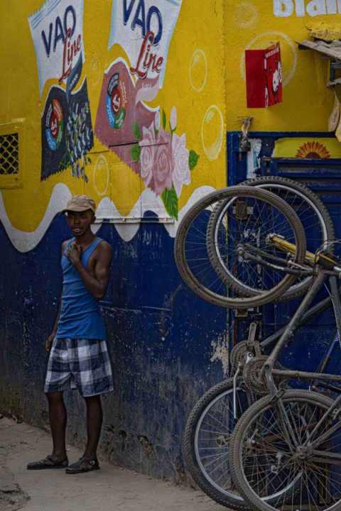 Madagascar Homme 7 mars 2026Ambodiranobicyclettehomme en débardeurjaune et bleu roismur publicitéouest tana