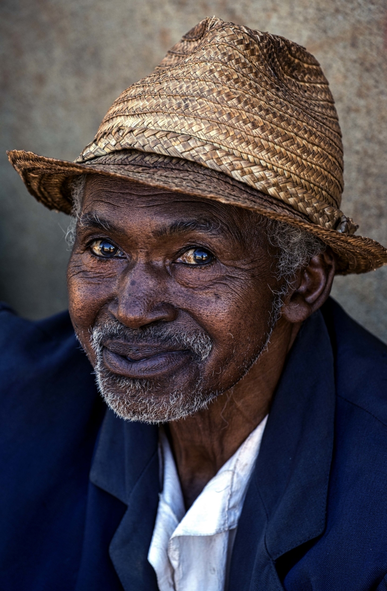 Madagascar Homme chapeaucheveux blancsGPhommeregard noissetteridesveste