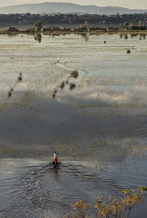 Madagascar Paysage barqueeauhommeseulsoiréetraverséevillage