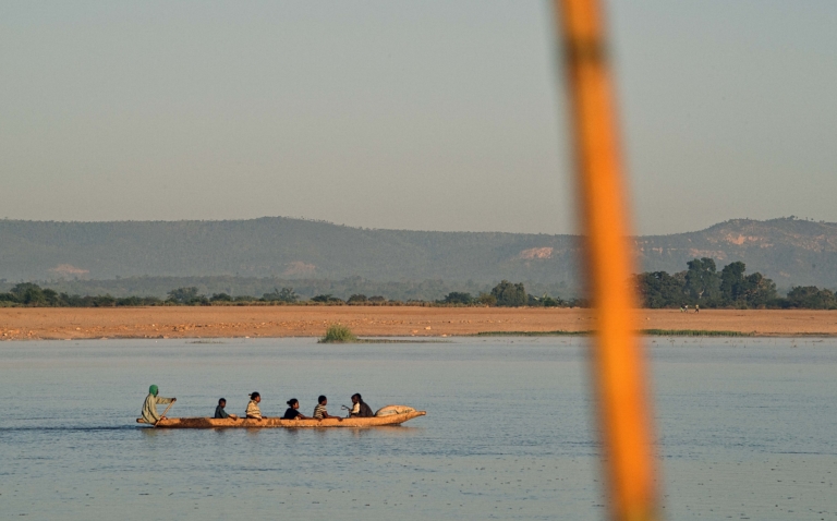 Madagascar Paysage crépusculefleuvemontagnepirogueramesoiréetraverséevégétationvoyageurs