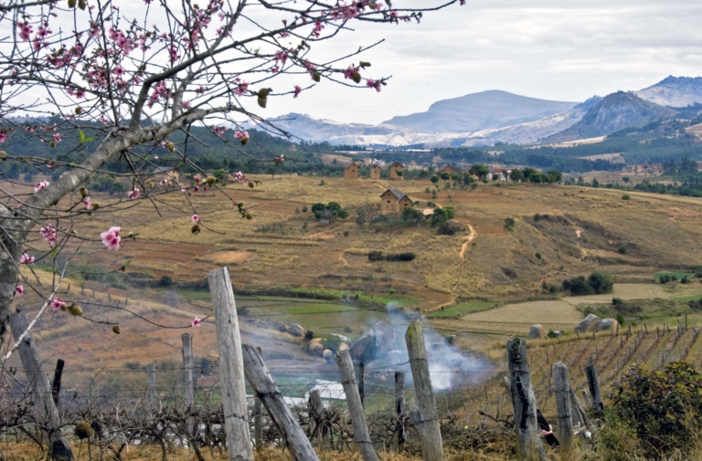 Madagascar Paysage barrièrebranchesfleursfuméemontagnesrizièrevillage