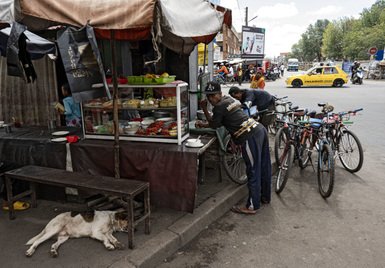 Madagascar Scene de RUE bicyclettechaisechiencomposéDimanche 27 avril 2025endormiGarazymine saonappe marronparasolsquatres cheminssalutsnackstation cycleTana ouesttrottoirvitrine