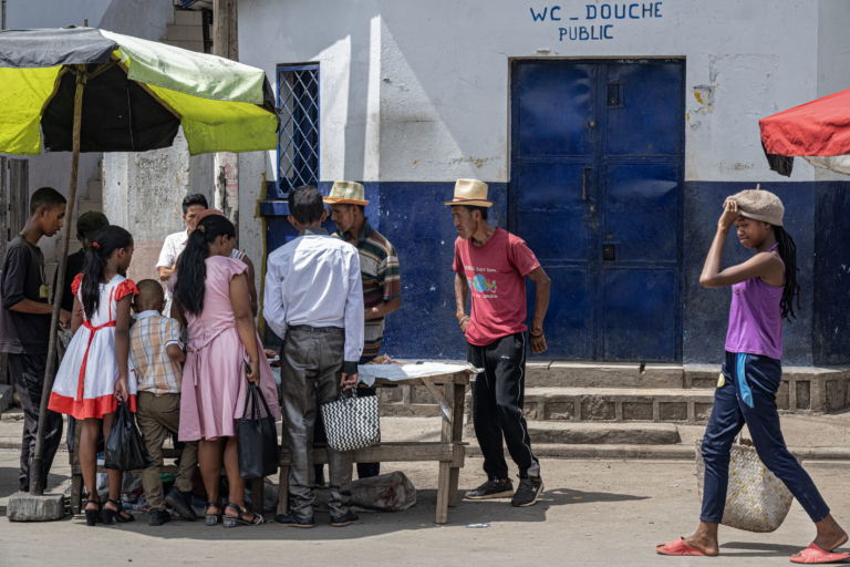 Madagascar Scene de RUE 31 déc 2023acheterAmbohimanarinaavy nivavakabloc sanitairechapeaufamillemur bleu etblancparasolpassantrobesatrokaTanan nord