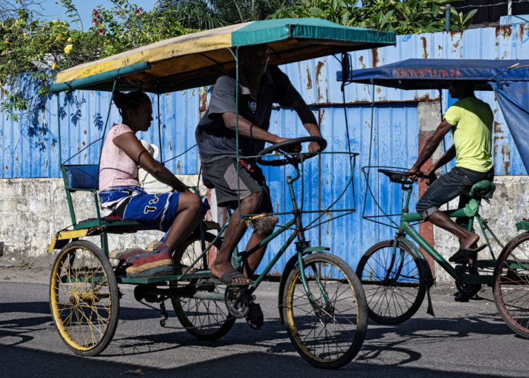 Madagascar Transport, Déplacements cyclo-pousseMadagascar Estmars 2025palissade bleuepassagerpousses locauxsac rafiastructures en fers à bétonsunVatomandry