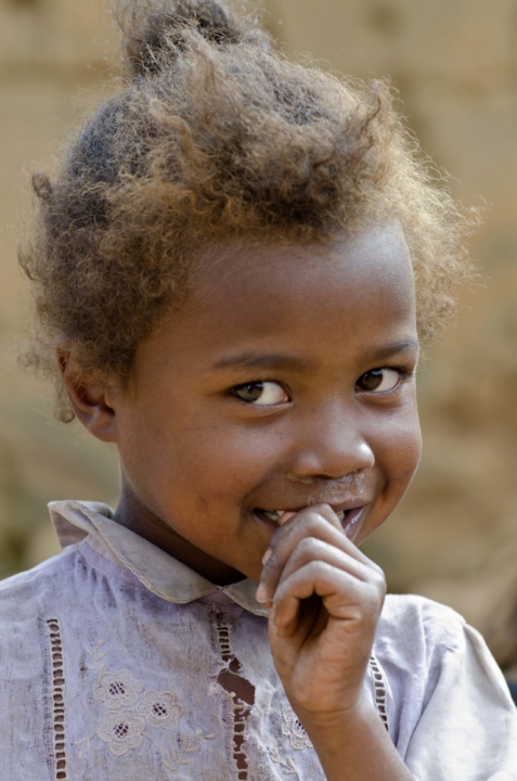 Madagascar Enfant cinq ansfillettemain dans la boucheravierobe brodéeroussesourire
