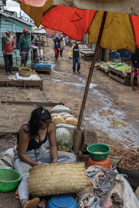 Madagascar Ville, Village 2 avril 2024Antsirabeau marcherbalancechemin de terrecheveux attachécuvettesgonyjeune femmemamofy voanjoborymozanaparasols orangeranosobikaun peu calmevoatavo